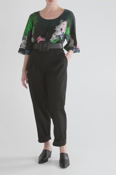 The Foljer Top features a flowing raglan sleeve and a soft scooped neckline. A versatile piece, the Foljer Top offers effortless styling as it can be worn tucked in or draped. The Foljer Top is offered in the limited seasonal Reflections Print, designed to easily pair with any neutral wardrobe basics. Explore earthy pinks, greens, and navy with the Foljer Top. The Reflections Print is a yardage print. Print placement on each garment will vary.